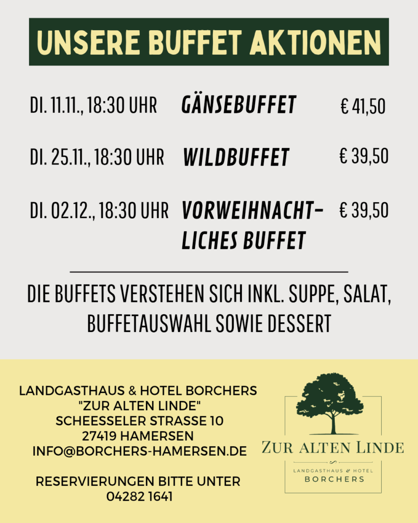 Unser Landgasthaus „Zur alten Linde“ ist ein in dritter Generation geführtes Restaurant mit angeschlossenem Hotel und Saalbetrieb. Im beschaulichen Hamersen – 3 km von Sittensen gelegen – ist unser Landgasthaus zentral zwischen Bremen und Hamburg gelegen mit Autobahnanschluss über Sittensen. Wir verfügen zudem über Stellplätze für Wohnmobile. Unser Restaurant steht für gut bürgerliche Küche in gemütlicher Atmosphäre. Dabei achten wir auf die Verarbeitung regionaler Qualitätsprodukte und saisonale Schwerpunkte.